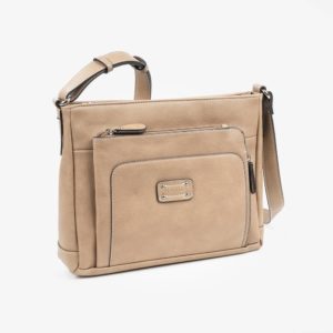 Bolso bandolera de piel sintética con asa de bandolera, extraíble, extensible y logotipada. Tiene cierre de cremallera, dispone de tres bolsillos interiores, dos delante y uno detrás con cremallera, más otro exterior detrás también con cremallera. Detalles en piel sintética en rojo y verde. Colgante metálico personalizado con el logotipo de la marca. Interior de poliéster.