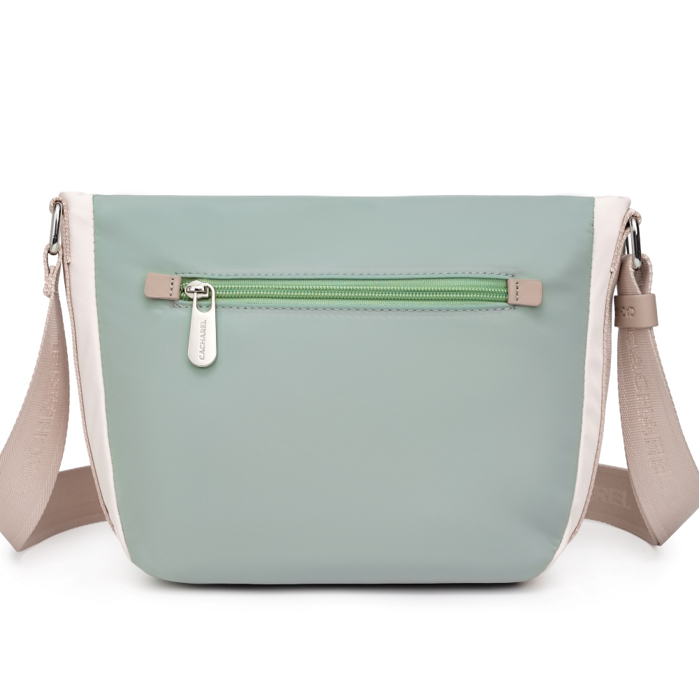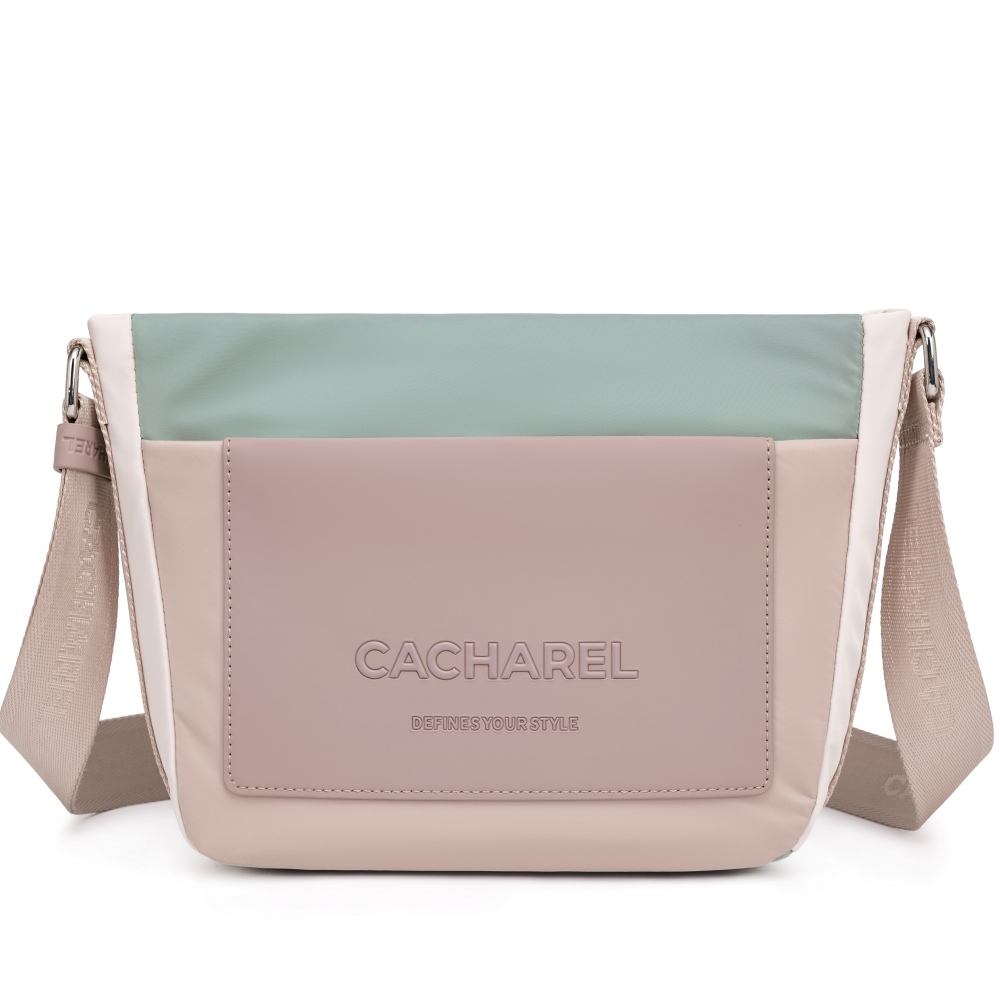 Bolso bandolera confeccionado en nylon, un material ligero y resistente, perfecto para el uso diario. Presenta un diseño en bloques de color con tonos suaves y modernos que aportan un estilo actual y versátil.