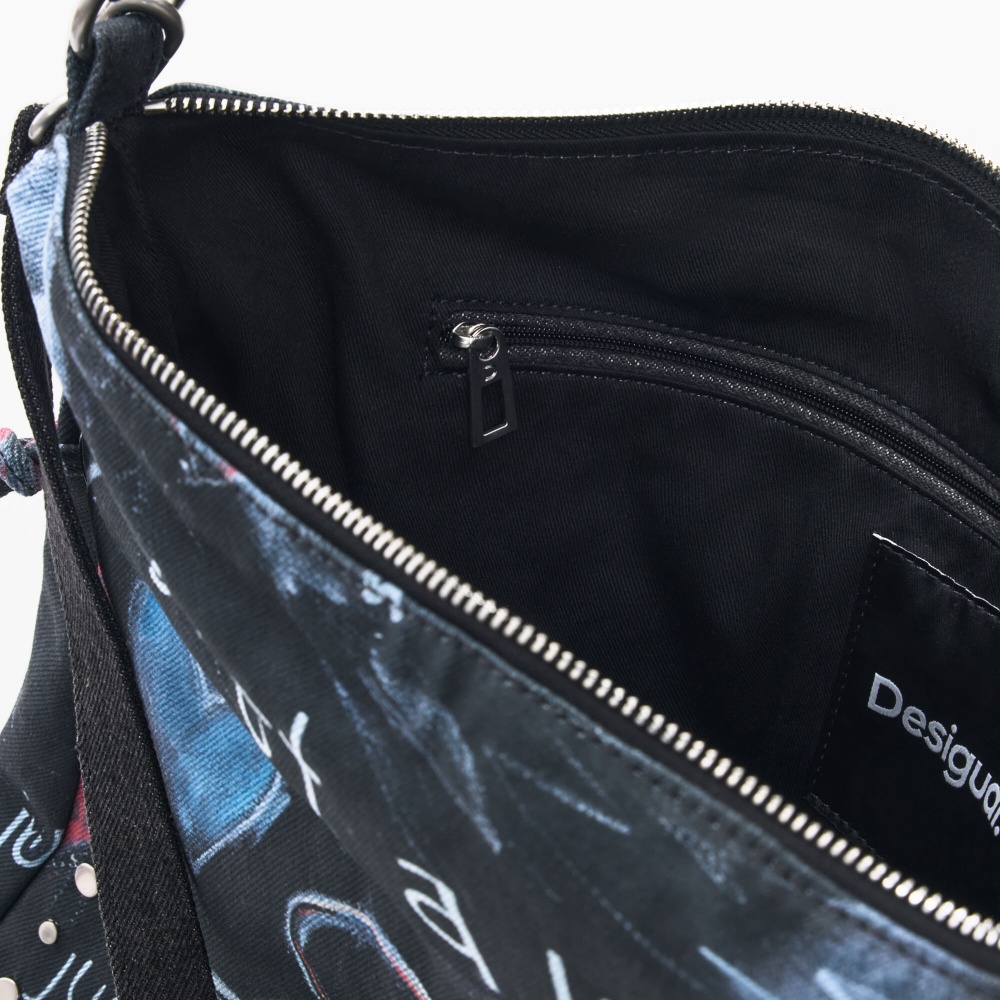 Bolso de hombro de formato grande en tejido efecto vaquero con print estilo grafiti, asa intercambiables y detalle de tranzados en los laterales.