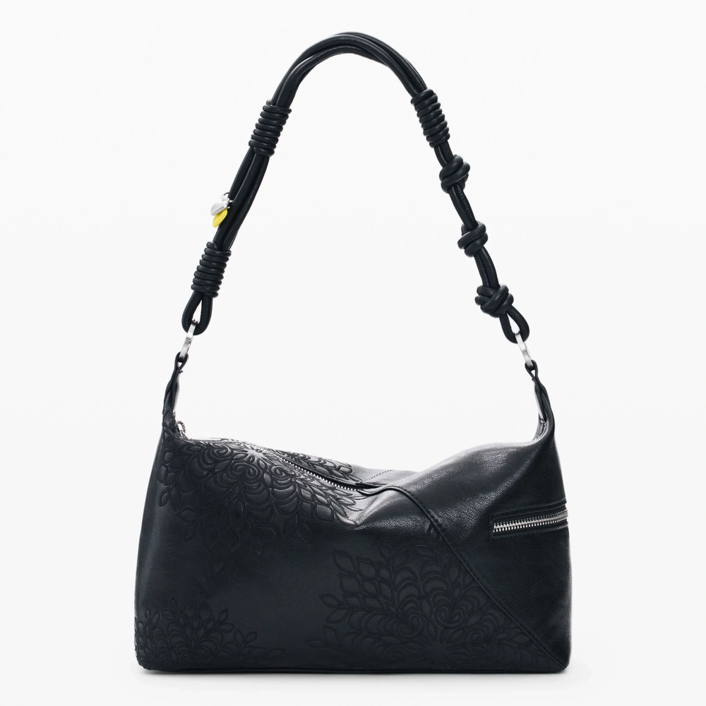 Bolso mediano con asas intercambiables, detalles de charms y bordados de mandalas en efecto piel.