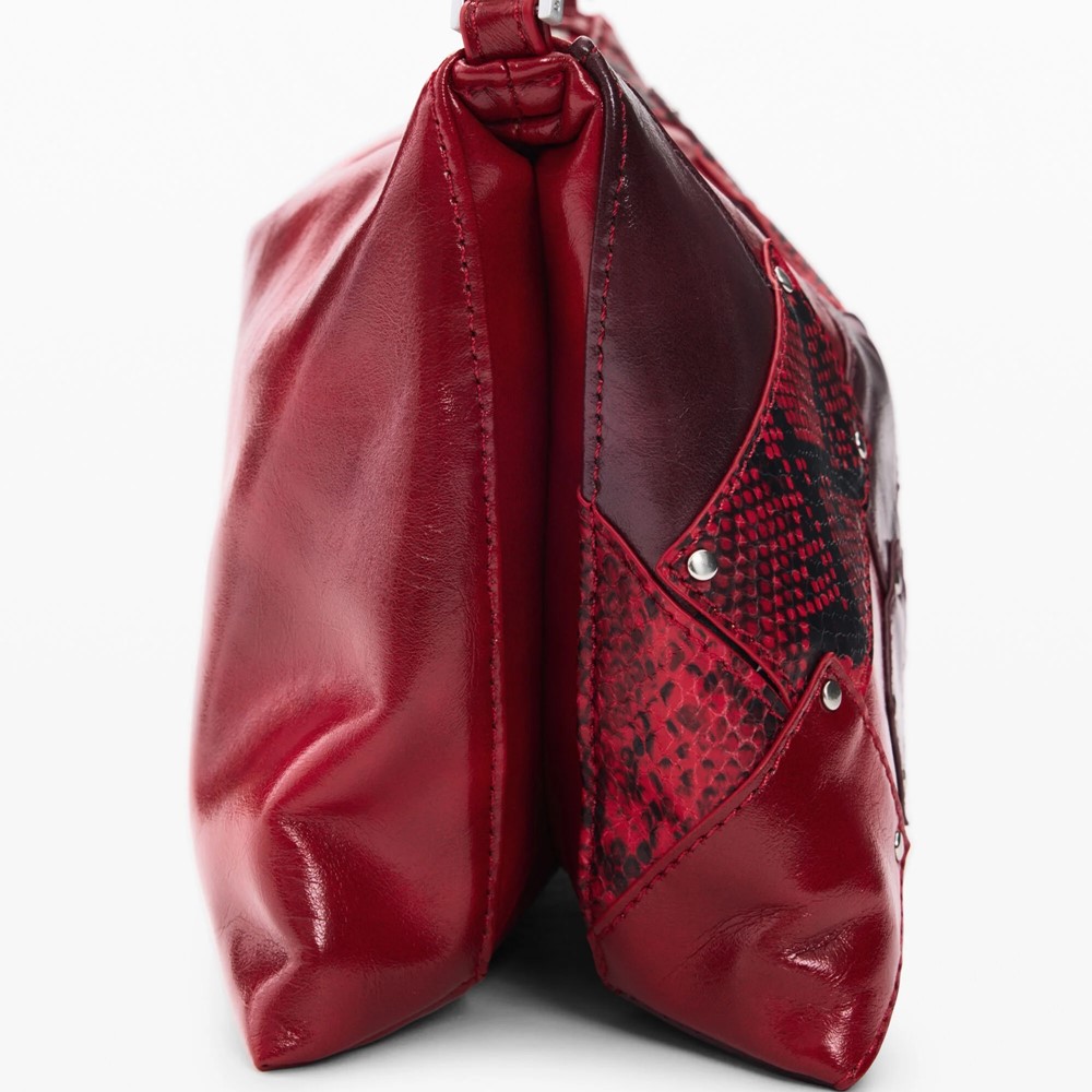 Bolso mediano con estampado de parches de estilo patchwork en combinación de tonos y remaches metálicos.