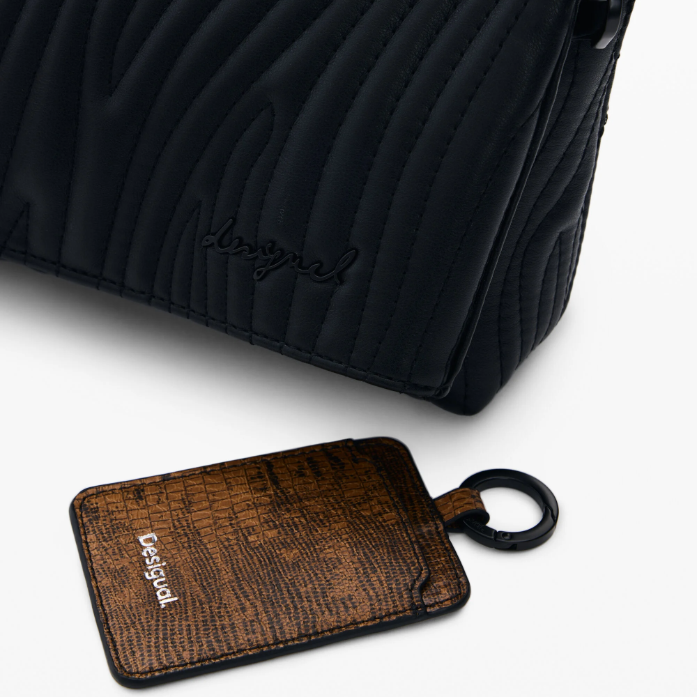 Bolso pequeño con solapa, confeccionada en tejido con textura, con asa trenzada y detalle de charm con tarjetero.
