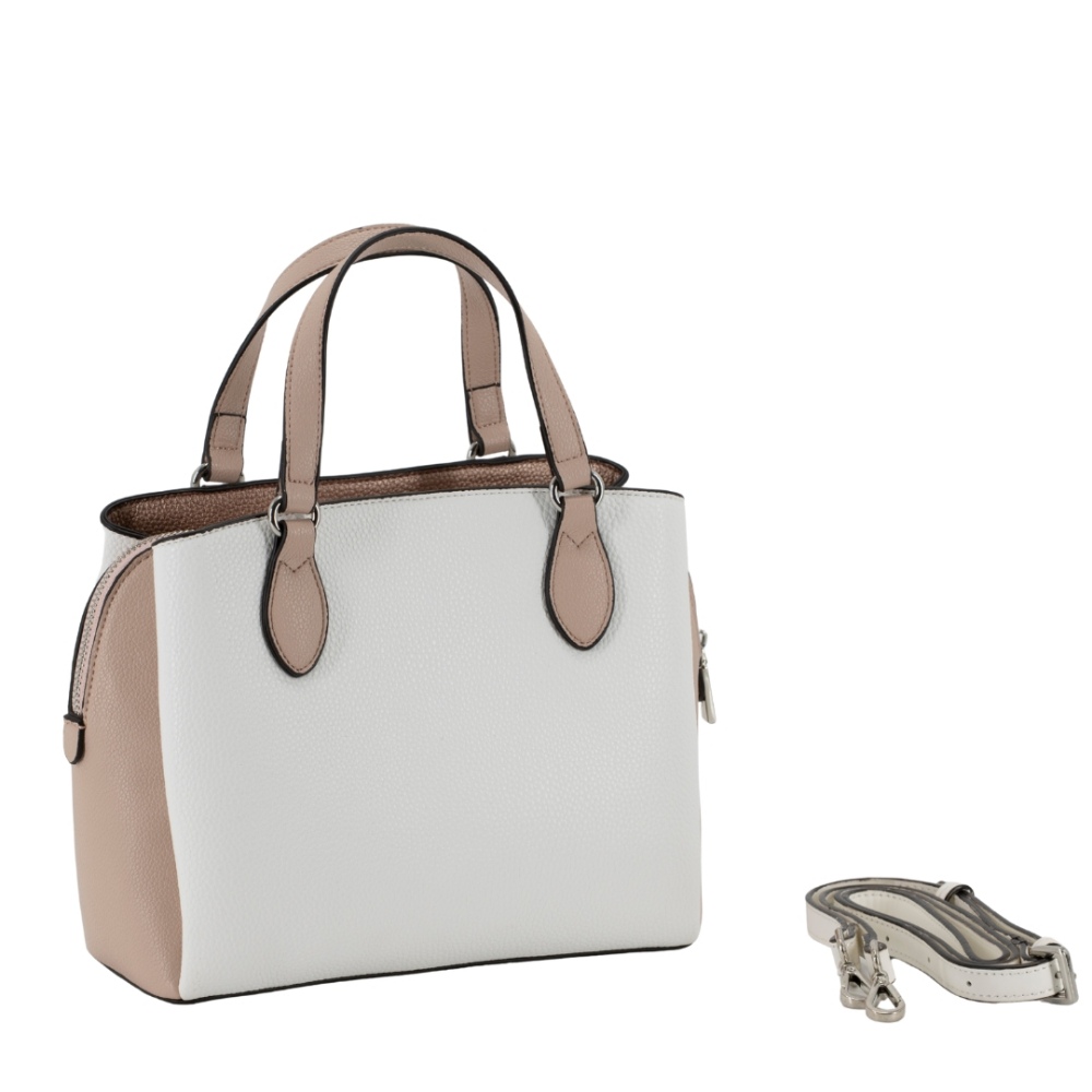 Bandolera de tamaño mediana en tonos blanco y castaño, con la bandolera de asa regulable. Dispone de dos asas cortas , cierre en cremallera, tiradores personalizados y varios bolsillos en el interior.