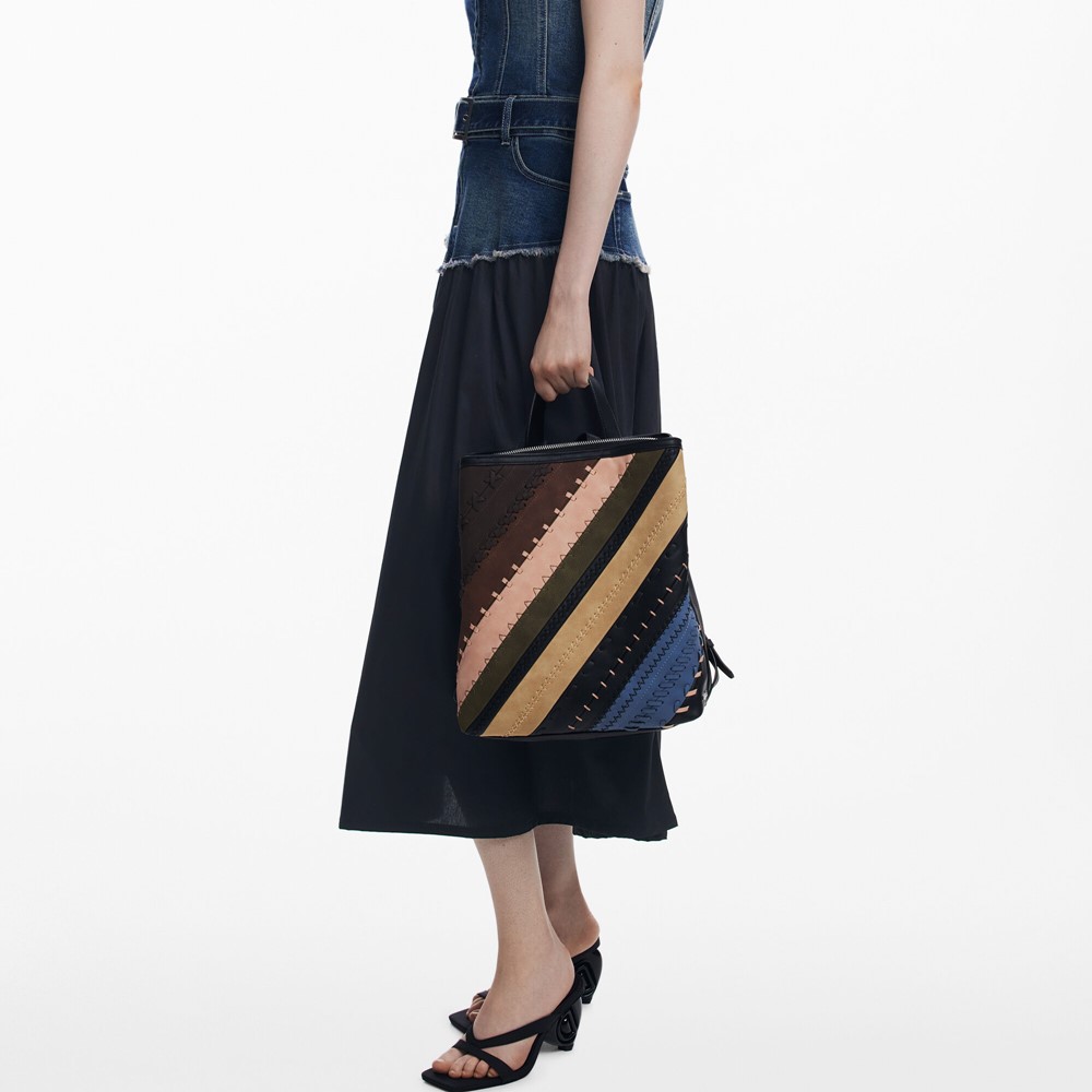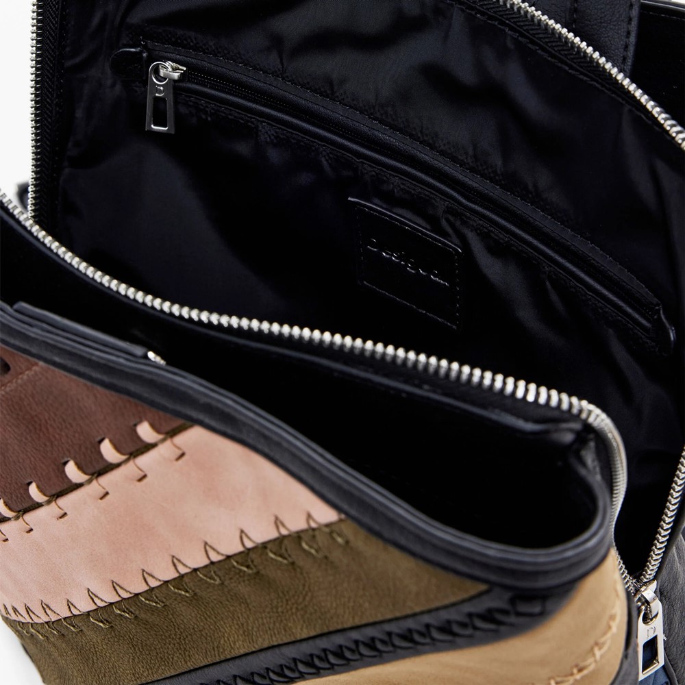 Mochila mediana en combinación de distintos tejidos efecto piel, con puntadas y trenzados y varios compartimentos interiores.
