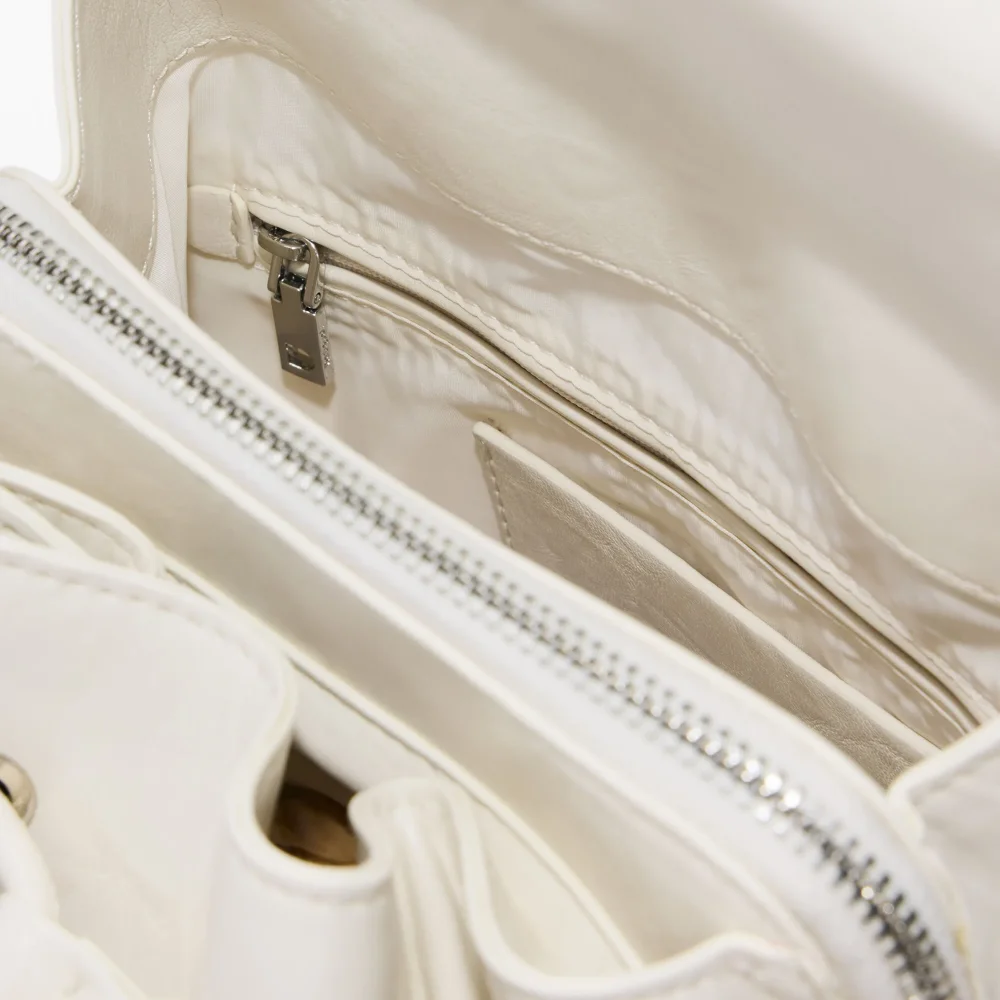 Mochila pequeña con solapa, detalle de correa de trecking extraíble, charm con tarjetero y logo grabado en relieve en el mismo tono.