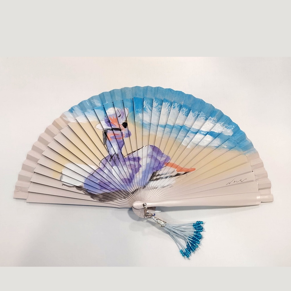 Abanico fabricado en madera, con diseño original estampado a mano en fondo beige y azul. Incorpora un abalorio y estuche para guardarlo.