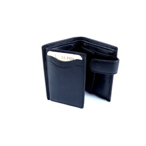 Billetero americano con monedero de piel vacuno, muy elegante y sobrio, con el sello de la marca grabado a fuego. Dispone de espacios para 5 tarjetas, 1 ventana transparentes para carnet y fotos. Monedero con cierre de broche y doble billetero en su interior. Cierre con trabilla y broche de presión.
