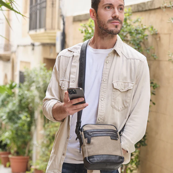 Bandolera mediana fabricada en lona y piel sintetica de alta calidad, tiene varios compartimentos que cierran con cremallera en la parte trasera y delantera. En su interior dispone de un bolsillo con cremallera y otro adicional para guardar su movil. El modelo tiene un asa bandolera con corredera para su fácil regulación en altura.