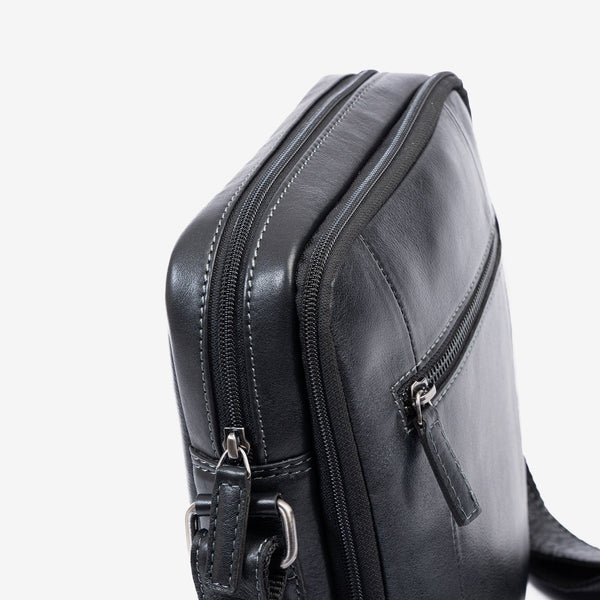 Reportero fabricado en piel vacuno de alta calidad, tiene varios compartimentos que cierran con cremallera en la parte delantera y trasera. En su interior dispone de forro textil y un bolsillo cerrado con cremallera. En la parte trasera tiene un bolsillo cerrado con cremallera. Asa bandolera con corredera para su fácil ajuste en altura.