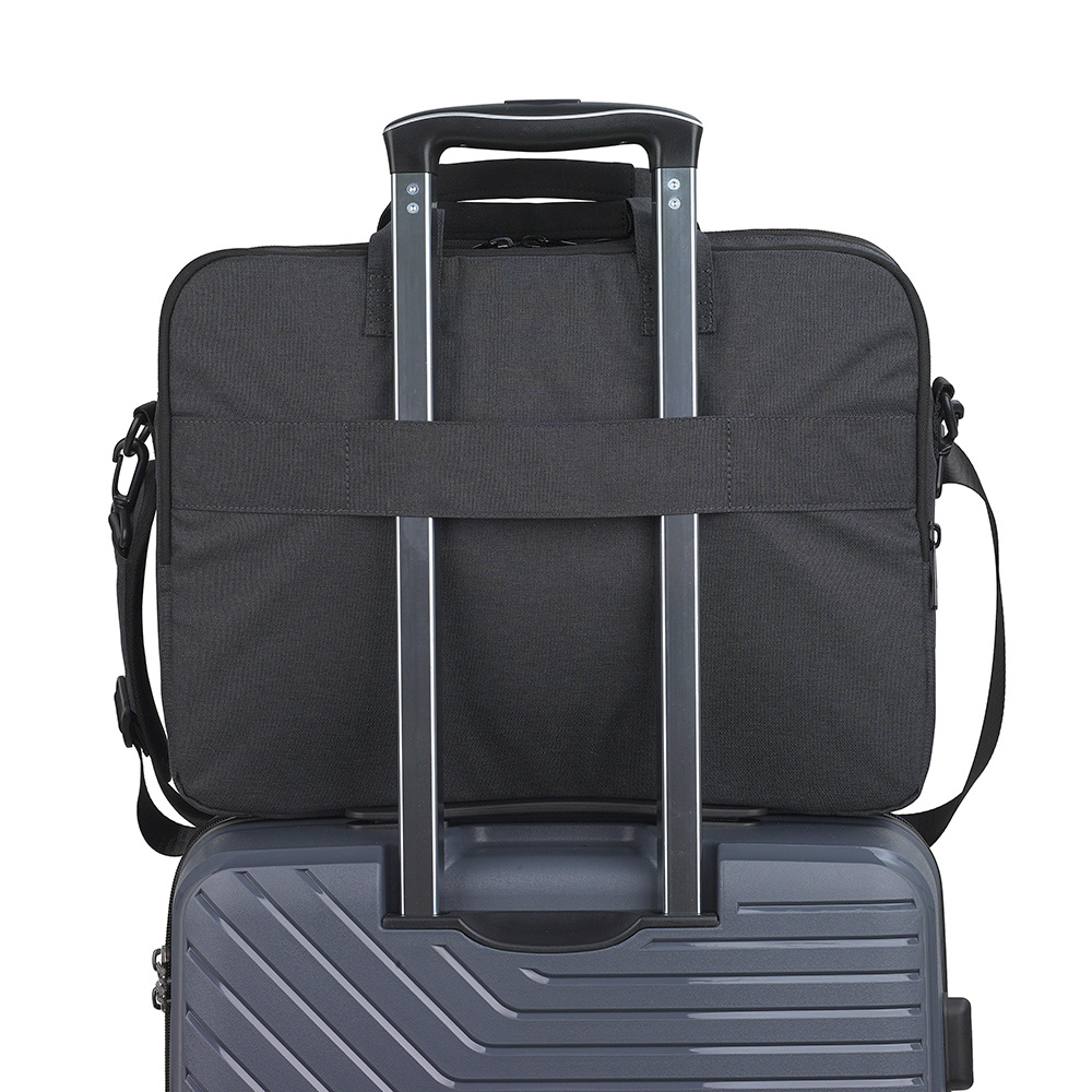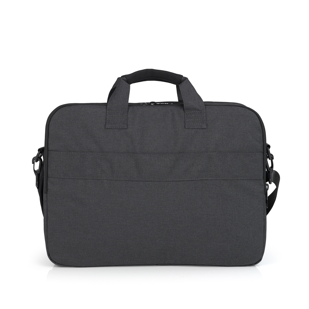 Maletín para portátil de 15,6” de material reciclado, gris, con tres compartimentos. El interior del maletín está forrado y acolchado, con organizador para portátil. Fabricado con material libre de plásticos PVC.