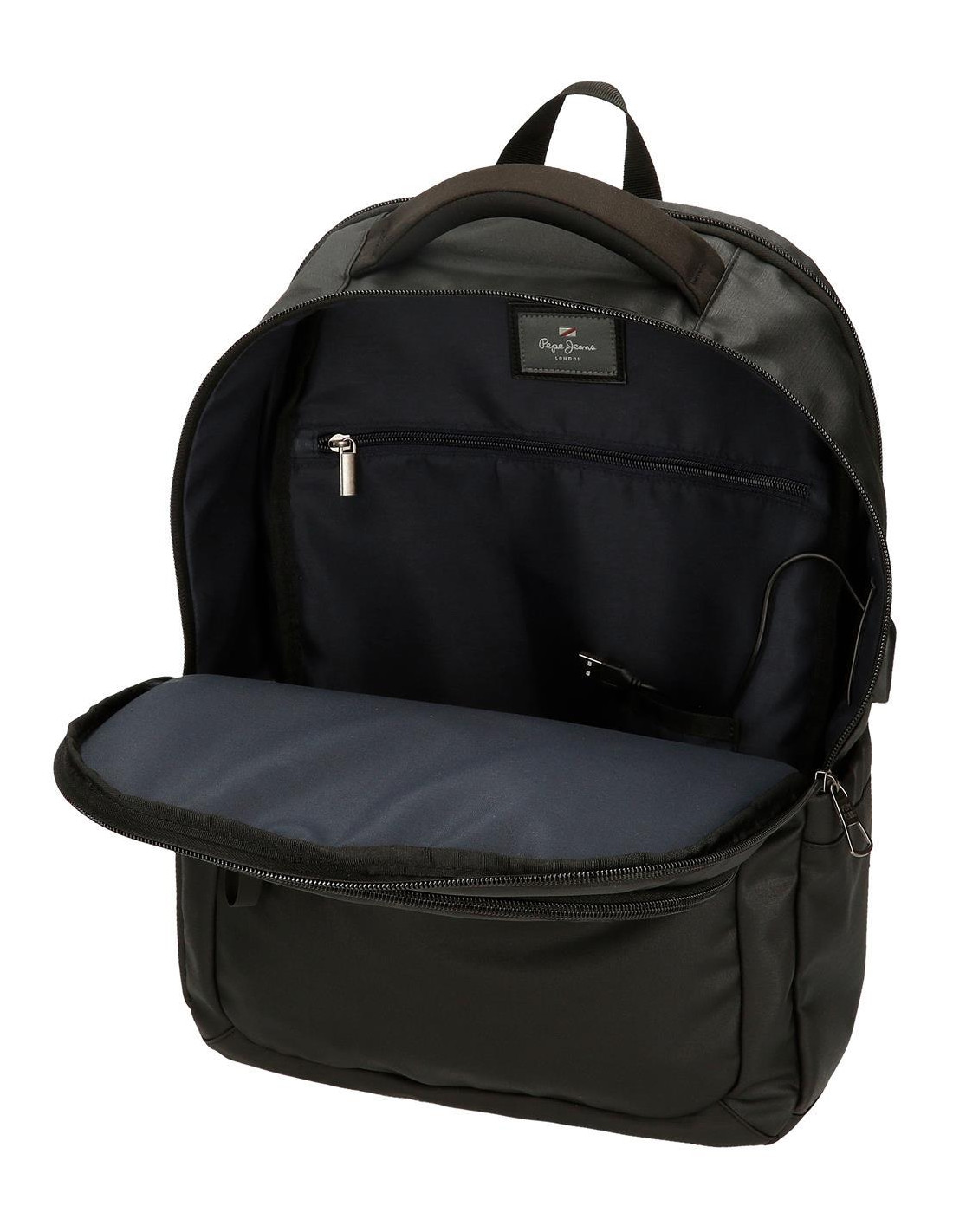Mochila portaordenador de Pepe Jeans fabricada en poliester. Compartimento principal con dos bolsillos, uno acolchado para un ordenador de hasta 15,6 pulgadas y otro para una Tablet. Con puerto USB integrado con cable para conectar a una batería externa.