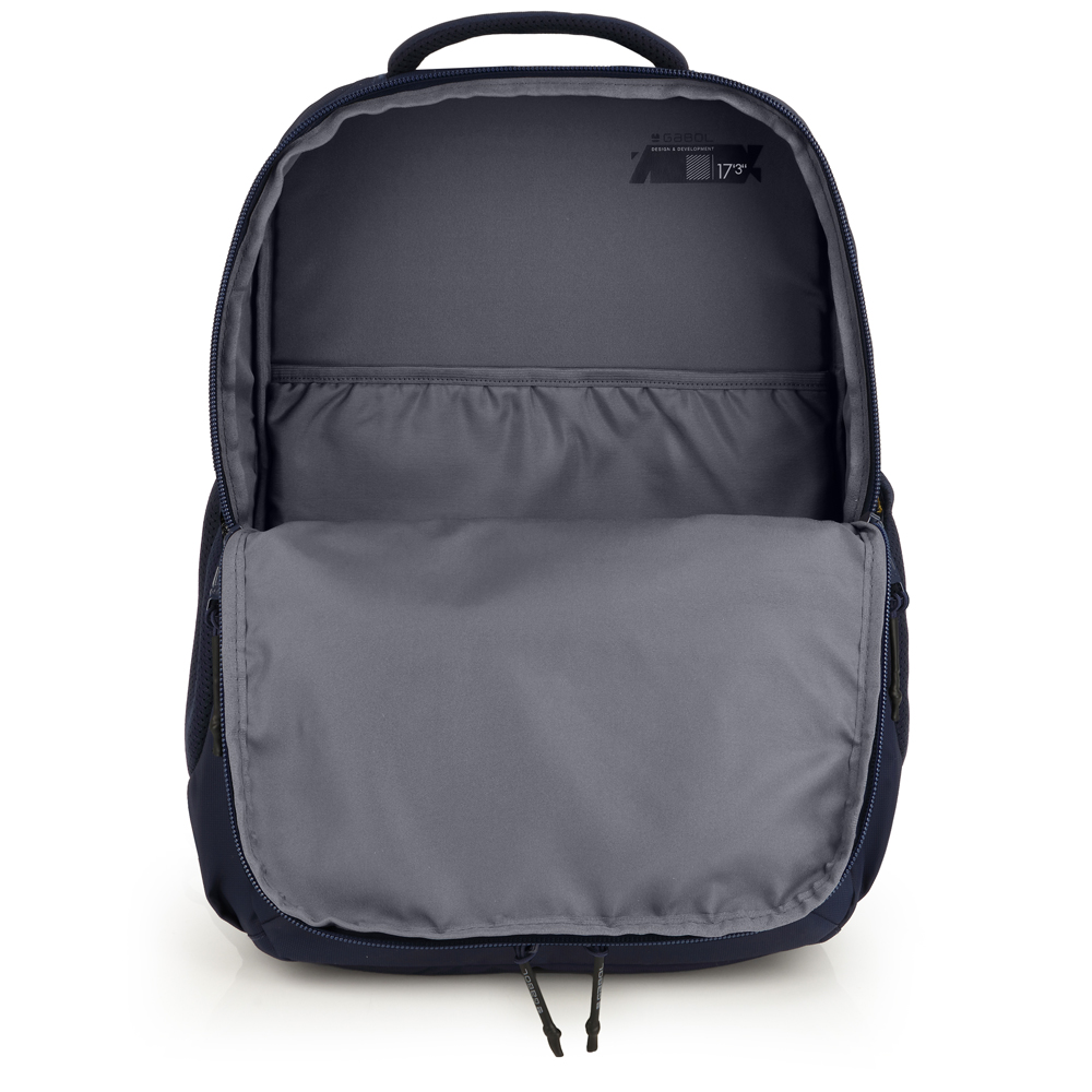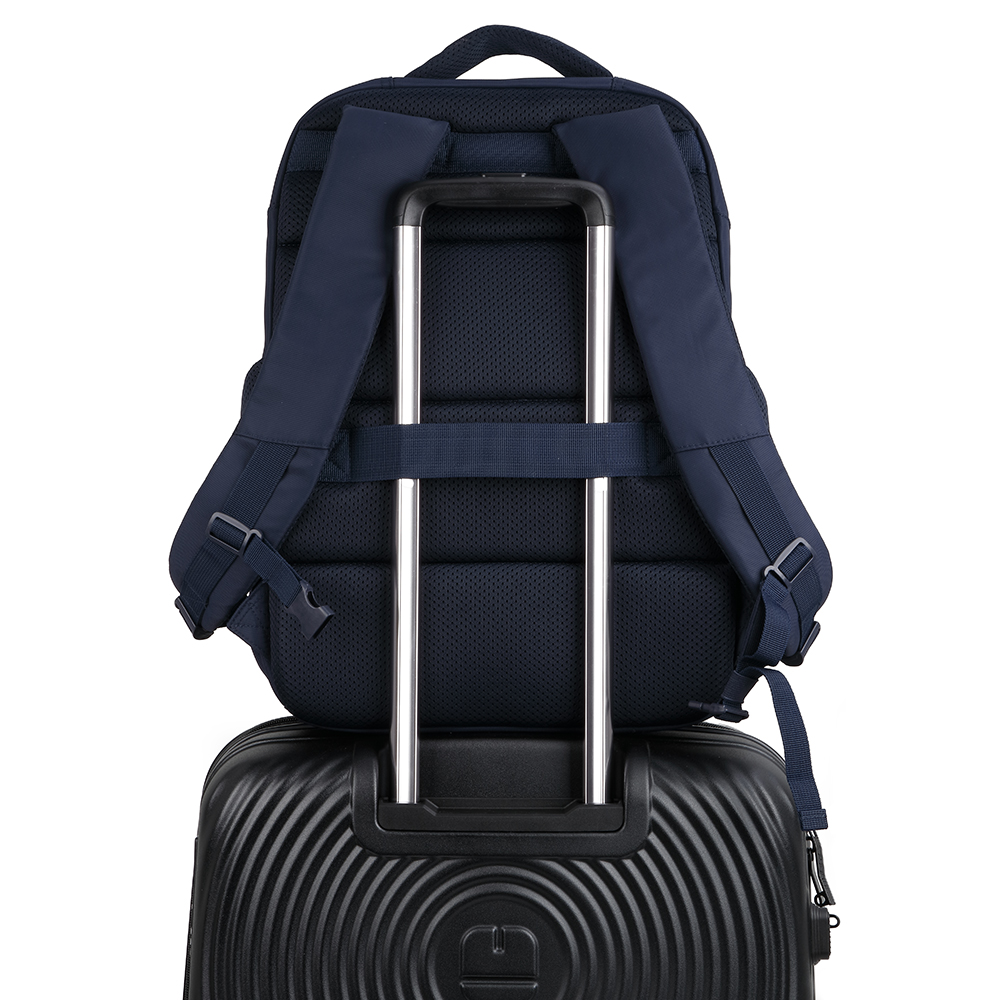 Mochila para portátil de 15,6″ de poliéster, con clasificador, organizador y con acople a maleta. Incluye forro de alta calidad, acolchado y con organizador para portátil. Fabricado con material resistente al agua y libre de plásticos PVC.